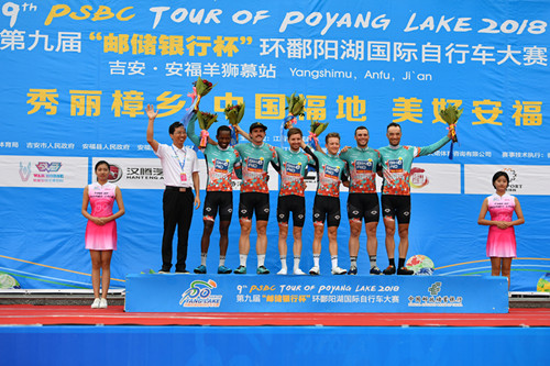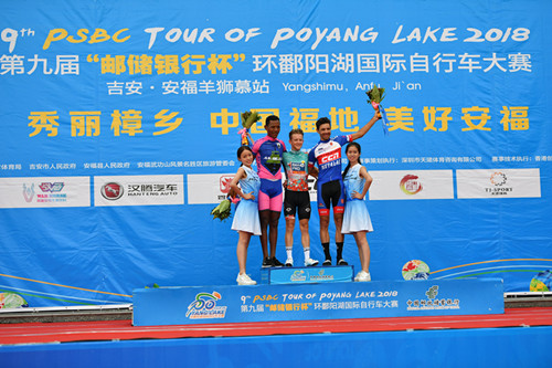 本賽段賽道全程16公里,是本屆環(huán)鄱賽設(shè)置的最短賽程。來自德國助力車隊的選手阿德內(nèi)?威廉簡僅用35分38秒完成比賽,奪得了本賽段的冠軍。昨日獲得爬坡王(圓點(diǎn)冠軍衫)的厄立特里亞車隊選手耶馬內(nèi)?謝加伊表現(xiàn)勇猛獲得亞軍并且繼續(xù)保有圓點(diǎn)冠軍衫。塞爾維亞CCN梅達(dá)勒車隊選手馬爾科?帕夫利察獲得季軍。荷蘭猴城樂園車隊選手馬爾滕?德容以第八名完成比賽的成績繼續(xù)保有個人總成績(藍(lán)冠軍衫)。最佳大中華(粉紅冠軍衫)和沖刺王(橙冠軍衫)獲得者均為中國熊貓CCN車隊選手彭源堂,這也是他連續(xù)三站同時穿上兩件領(lǐng)騎衫。